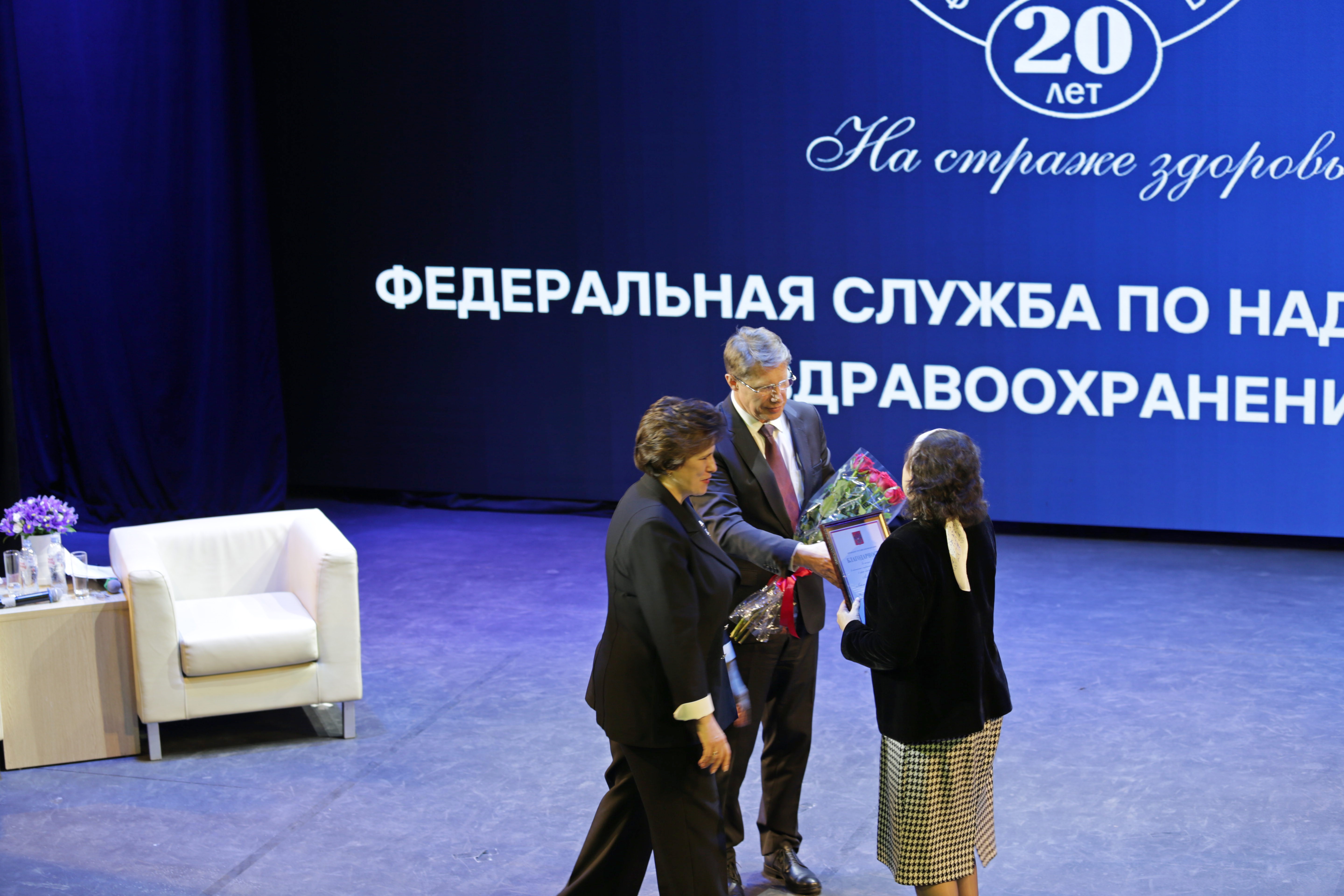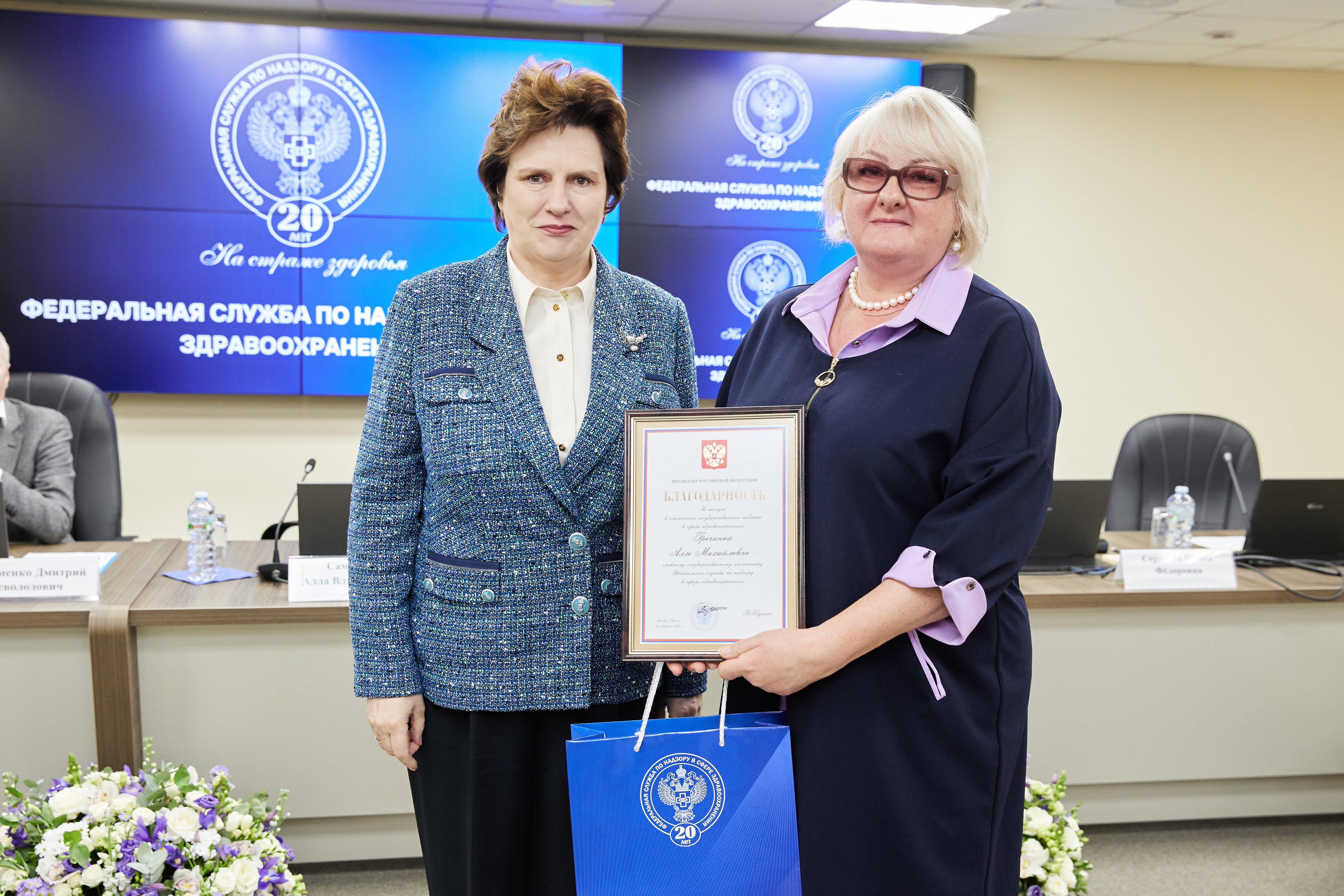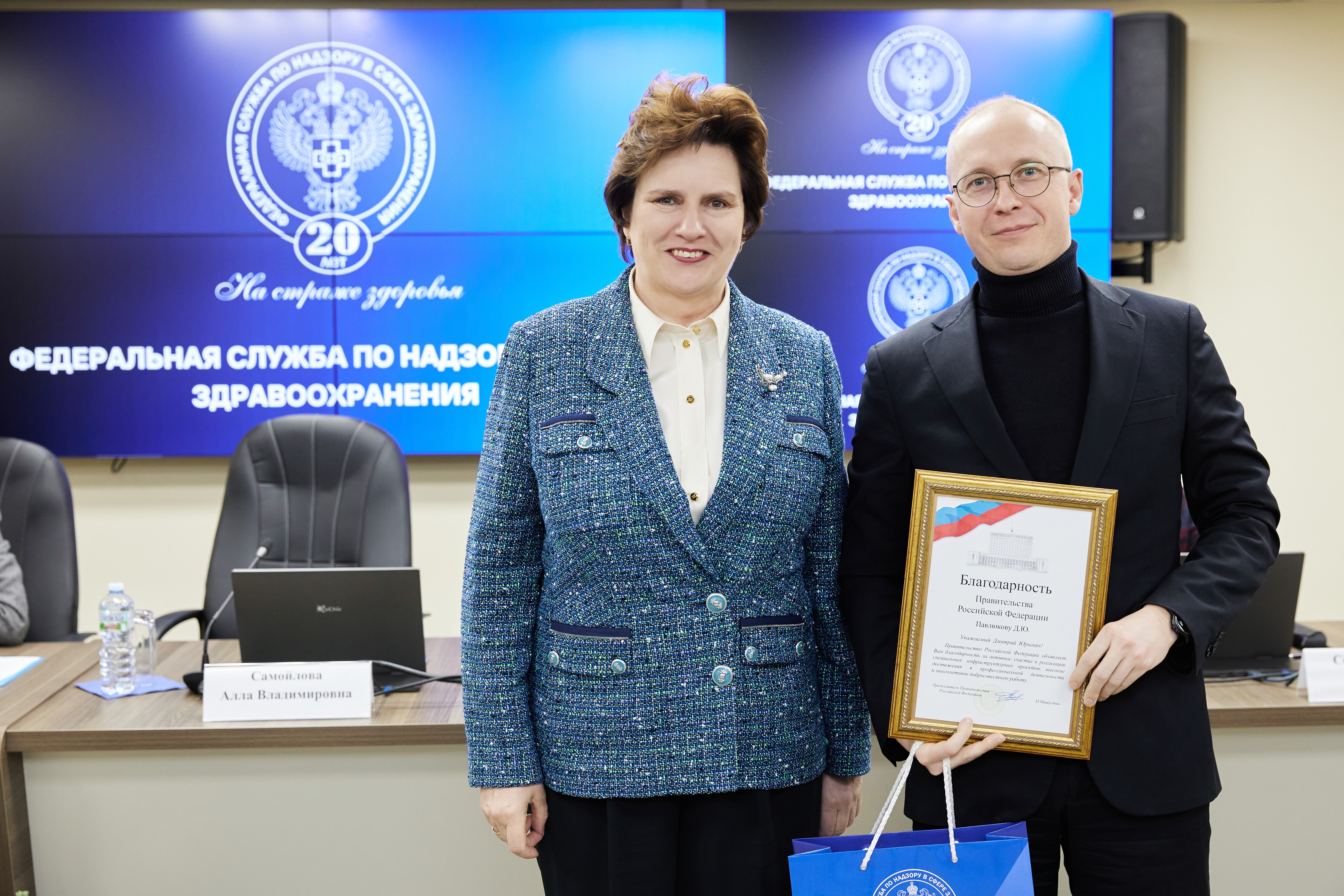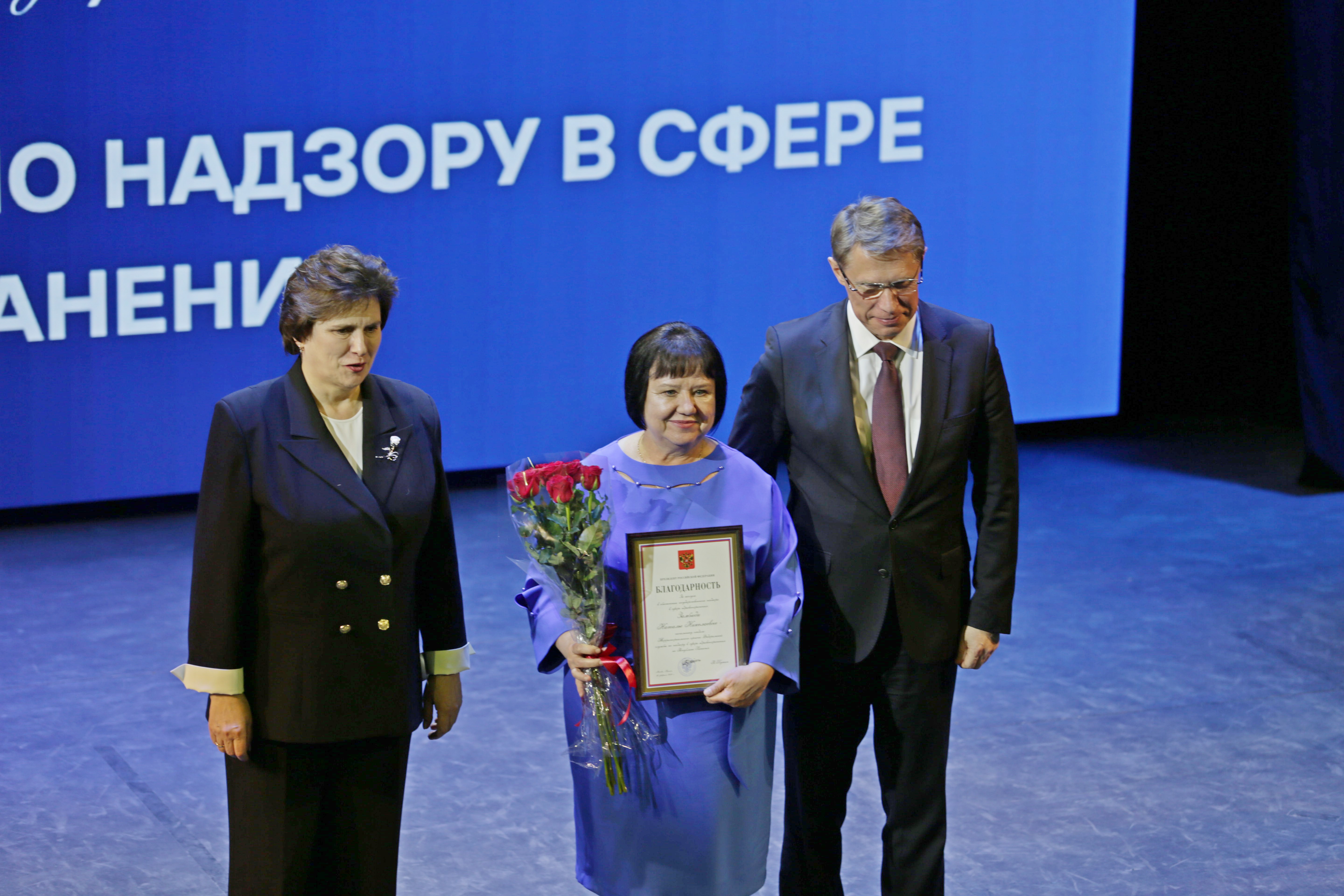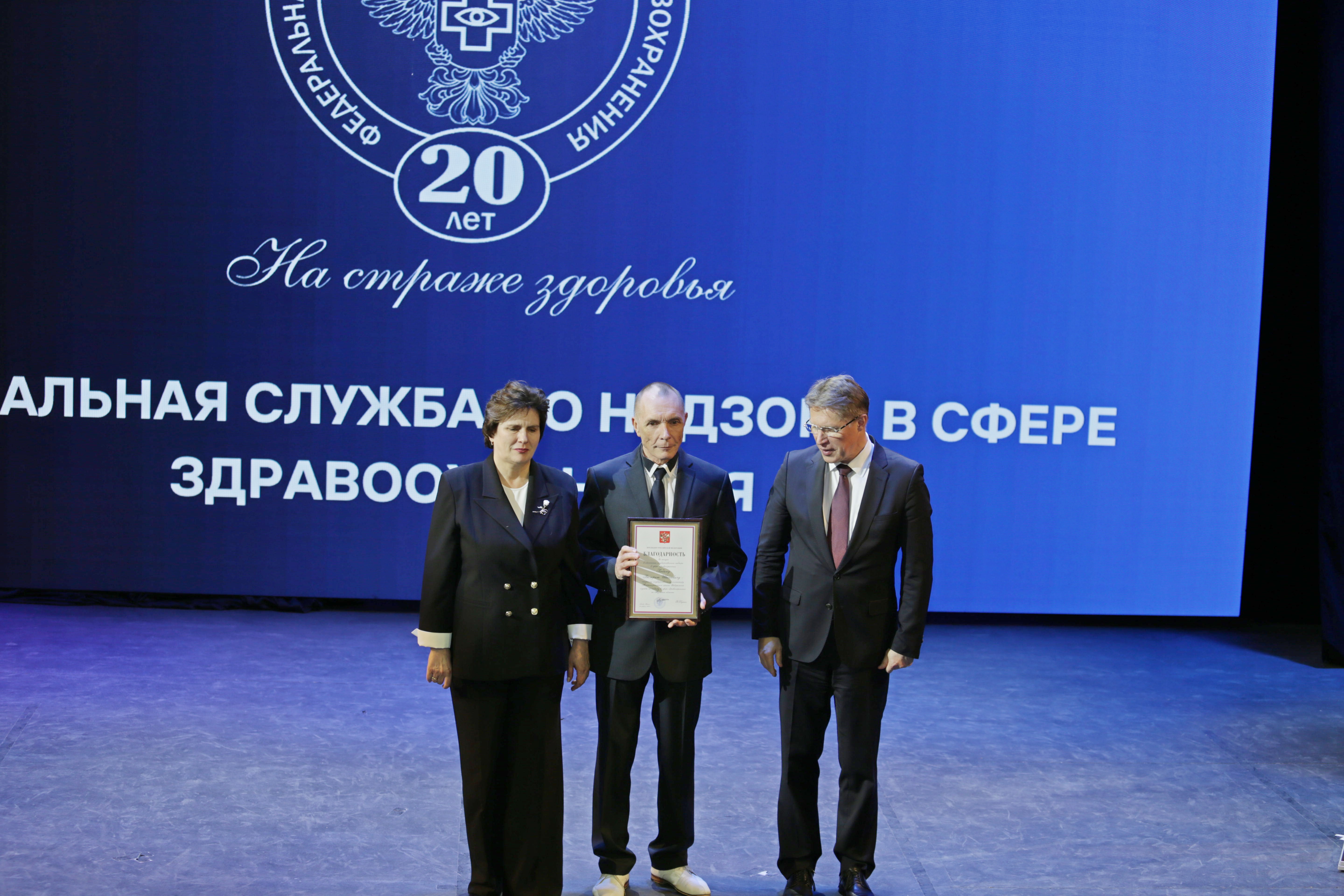 В рамках расширенной итоговой коллегии Минздрава России на международной выставке-форуме «Россия» коллектив Росздравнадзора получил Благодарность Президента Российской Федерации Владимира Владимировича Путина «За заслуги в обеспечении государственного надзора в сфере здравоохранения». Благодарность Президента РФ торжественно вручил руководителю Службы Алле Самойловой Министр здравоохранения Российской Федерации Михаил Мурашко.