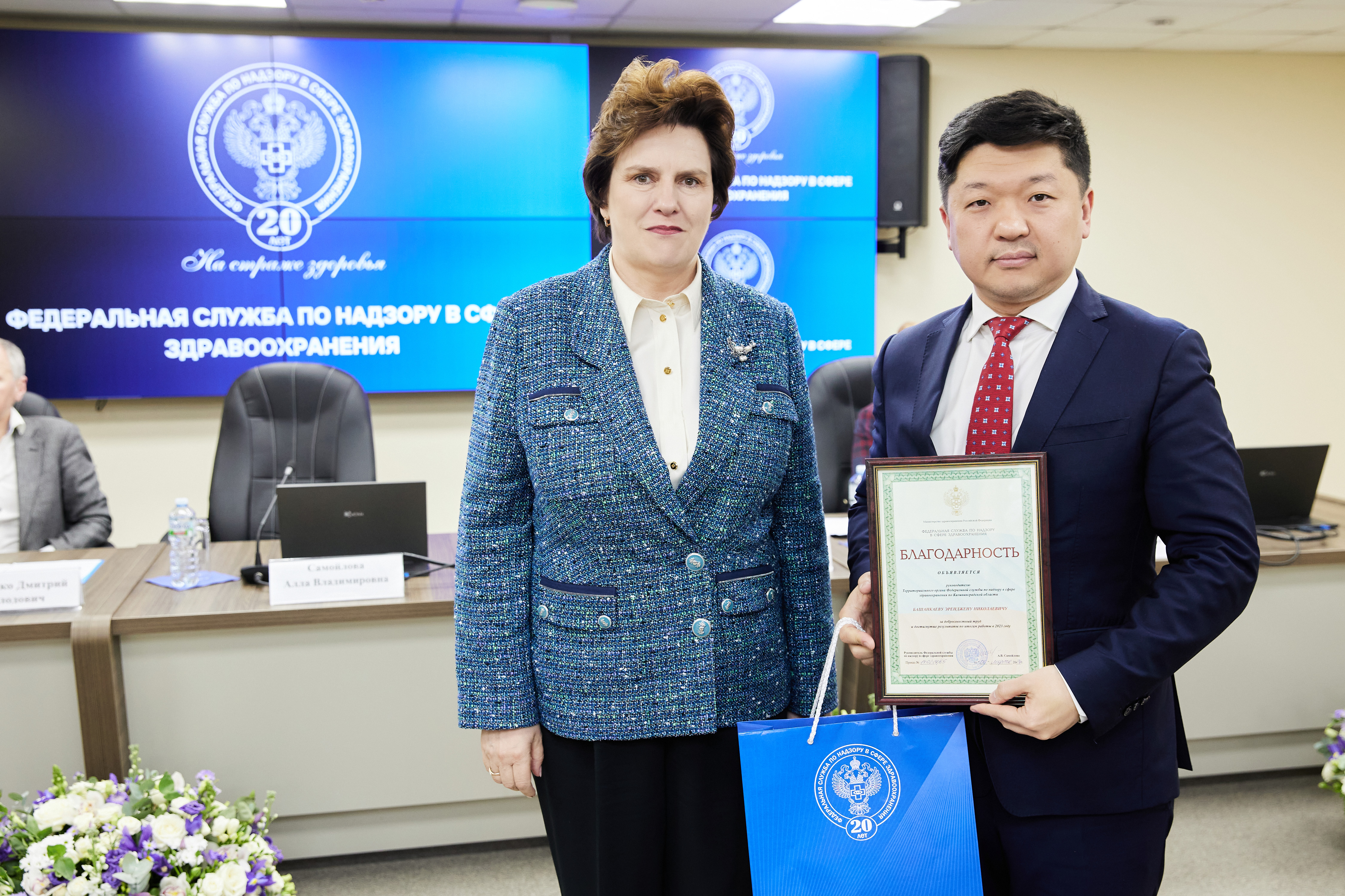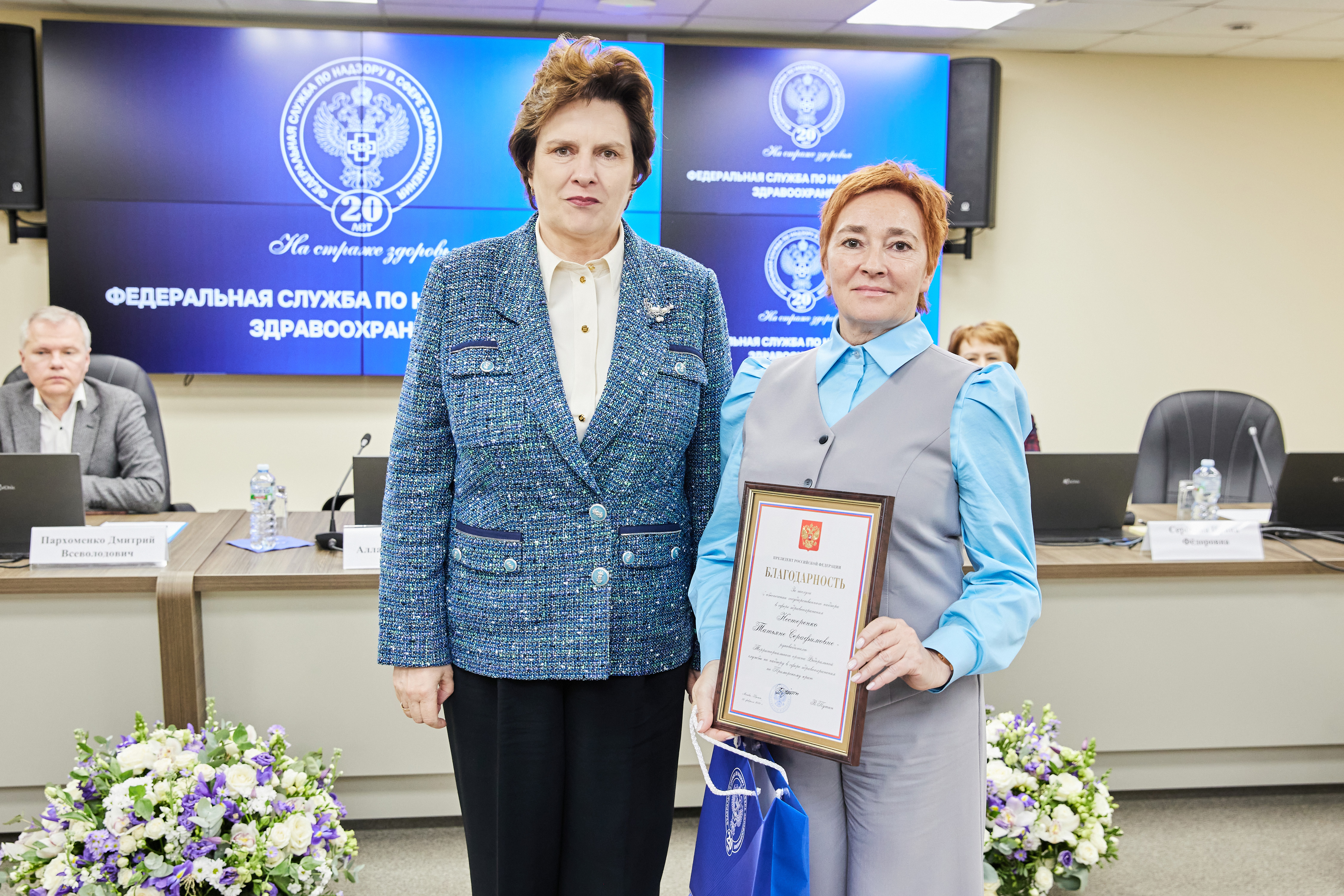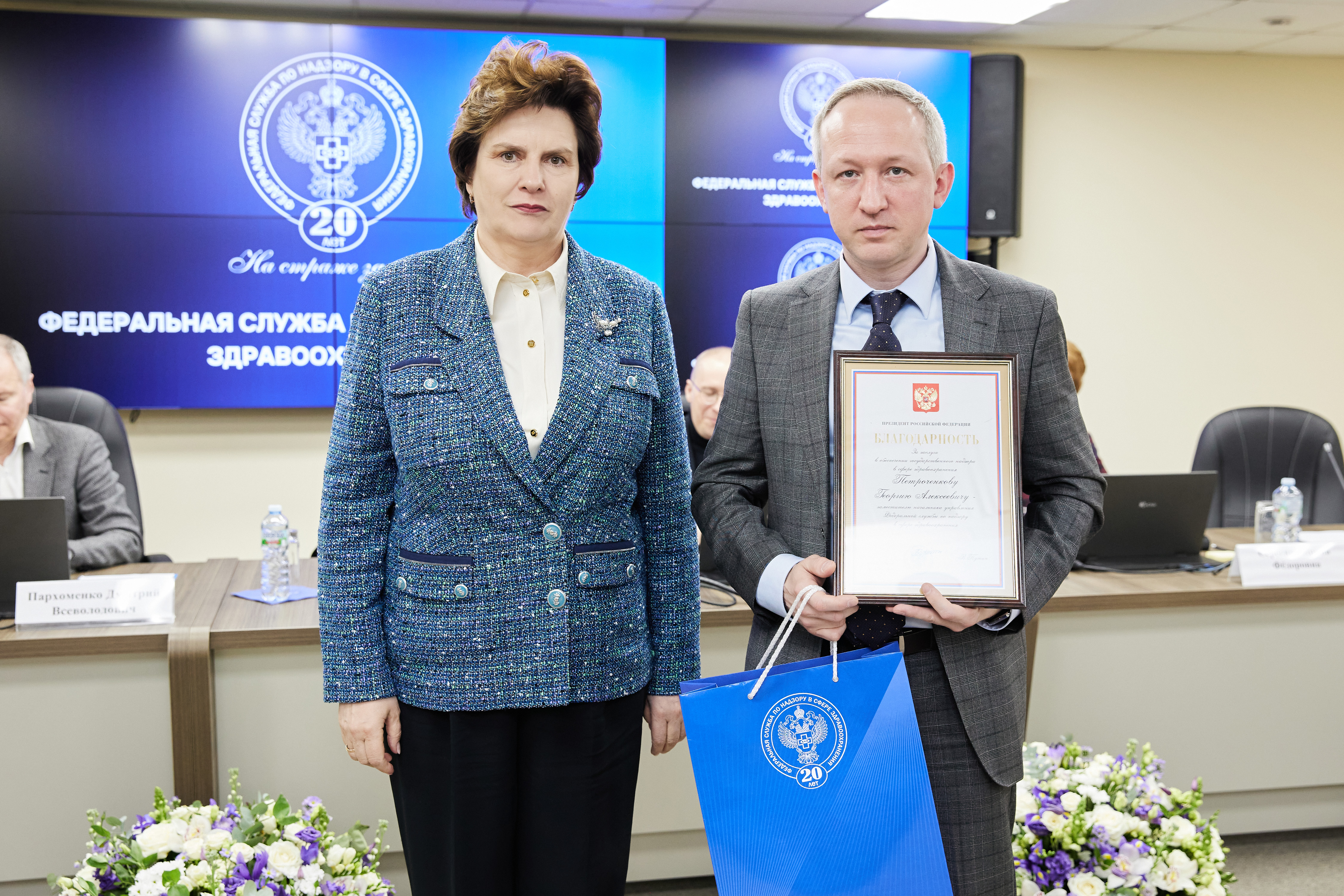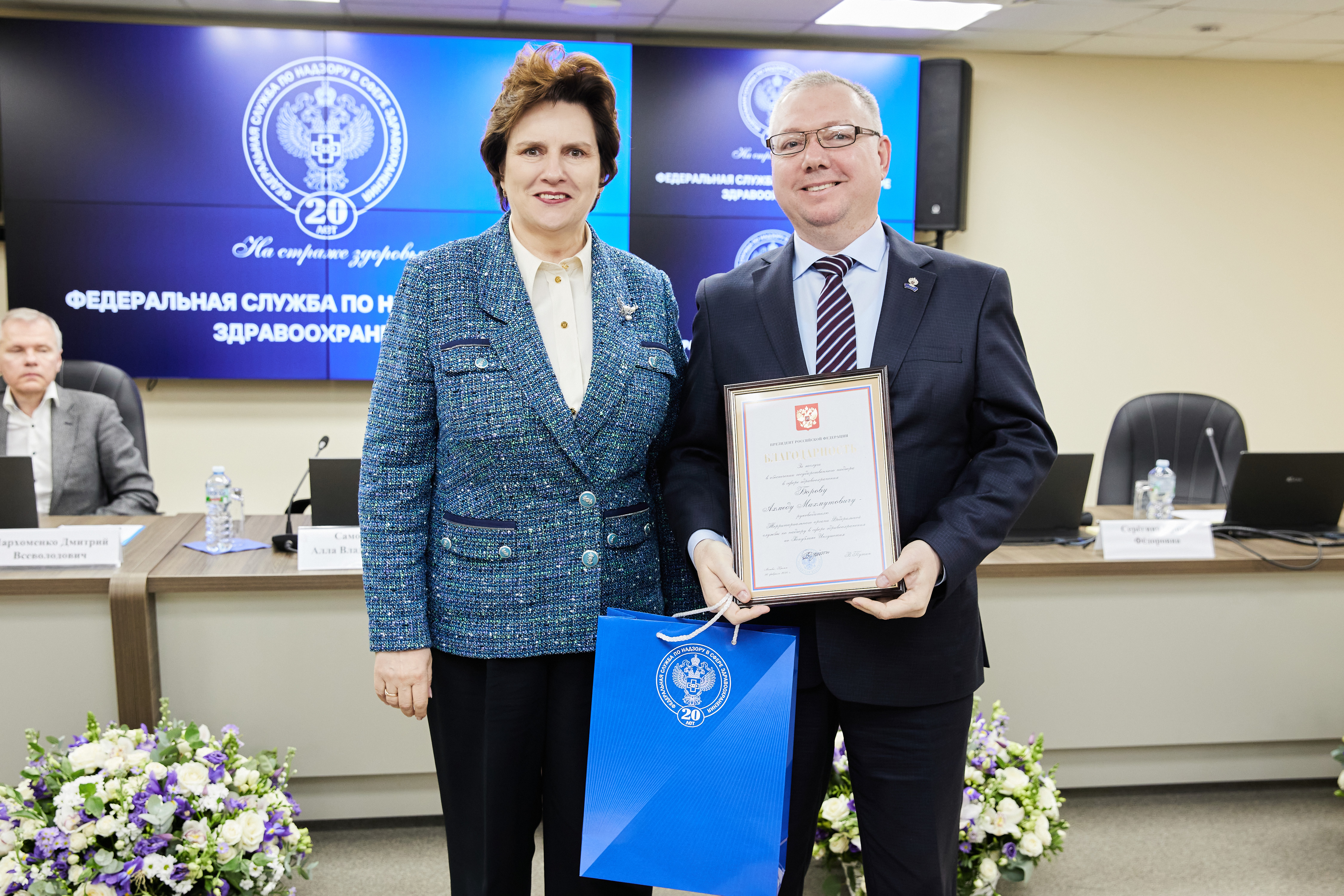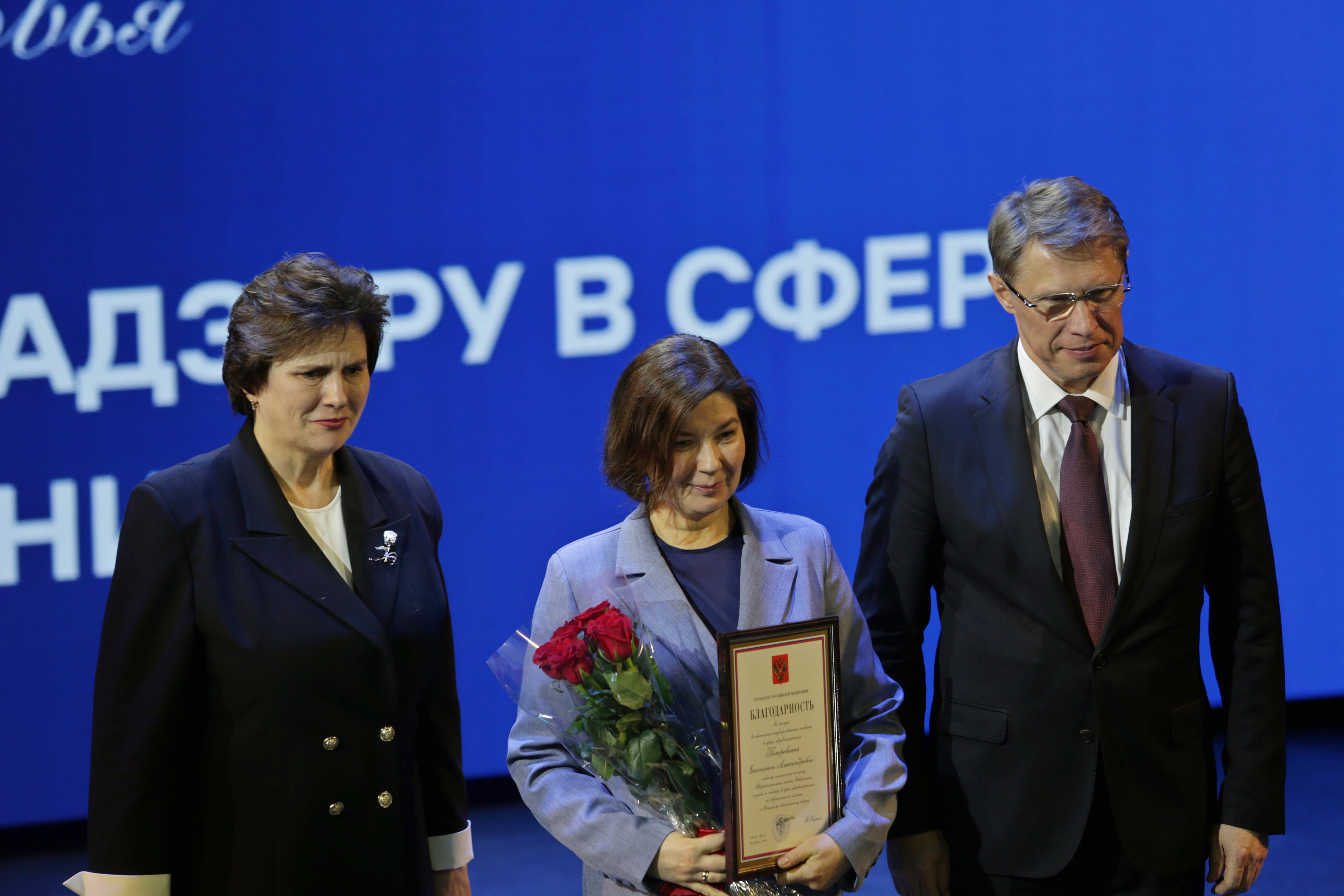 В рамках расширенной итоговой коллегии Минздрава России на международной выставке-форуме «Россия» коллектив Росздравнадзора получил Благодарность Президента Российской Федерации Владимира Владимировича Путина «За заслуги в обеспечении государственного надзора в сфере здравоохранения». Благодарность Президента РФ торжественно вручил руководителю Службы Алле Самойловой Министр здравоохранения Российской Федерации Михаил Мурашко.