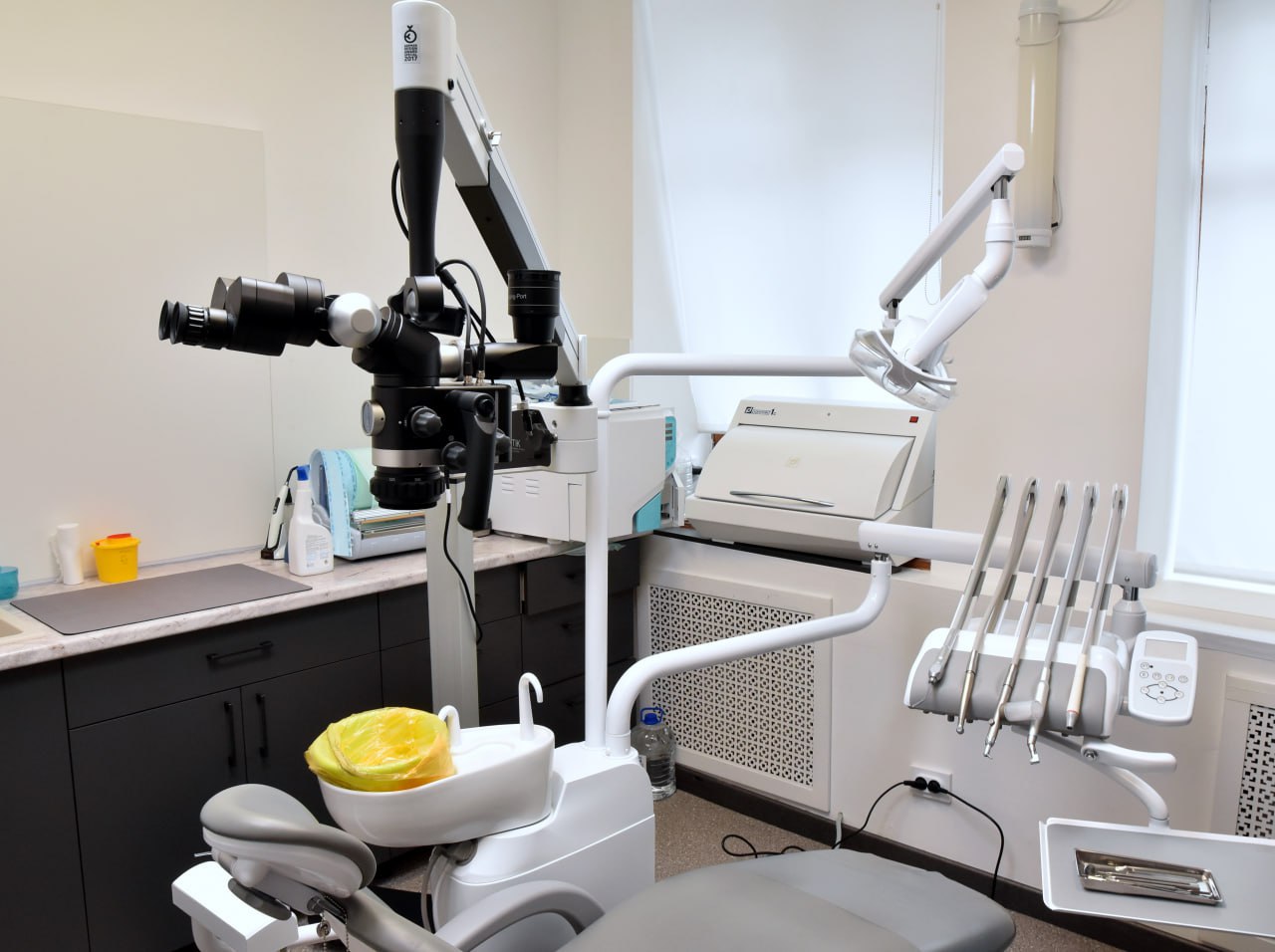Также закуплен стоматологический микроскоп, предоставляющий многократное увеличение, что позволяет увидеть мельчайшие структуры зубов и тканей без искажений и бликов. Оптическое увеличение крайне важно при пролечивании корневых каналов. Использование оптики позволяет врачу действовать максимально бережно и точно, сохраняя здоровые ткани зуба.